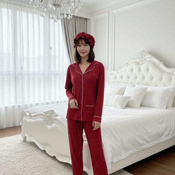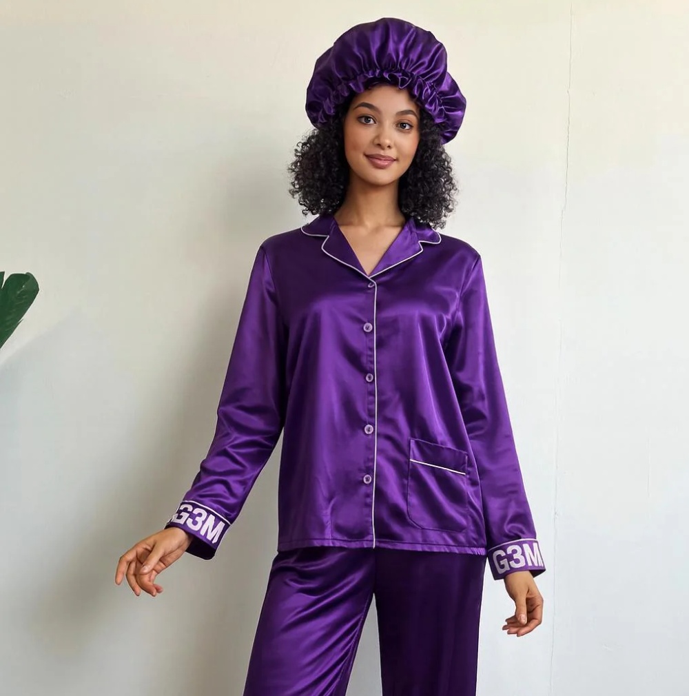 A bold and luxurious satin pajama set designed for comfort and style. Featuring a silky button-down top, relaxed straight-leg pants, signature cuff detailing, and a matching bonnet for hair protection. Smooth, breathable, and effortlessly elegant—perfect for elevated sleepwear and lounging.